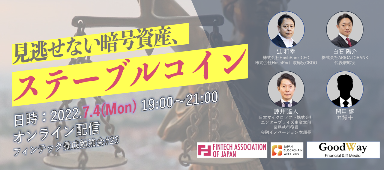 | 20:00 – 20:55 (55分) | パネルディスカッション 『ステーブルコインは日本の社会でこう生かせ(仮)』 モデレーター:藤井 達人 @日本マイクロソフト パネラー:関口 諒 弁護士 パネラー:吉田 世博 @Hashpalette/HashPort パネラー:白石 陽介 @ARIGATOBANK |