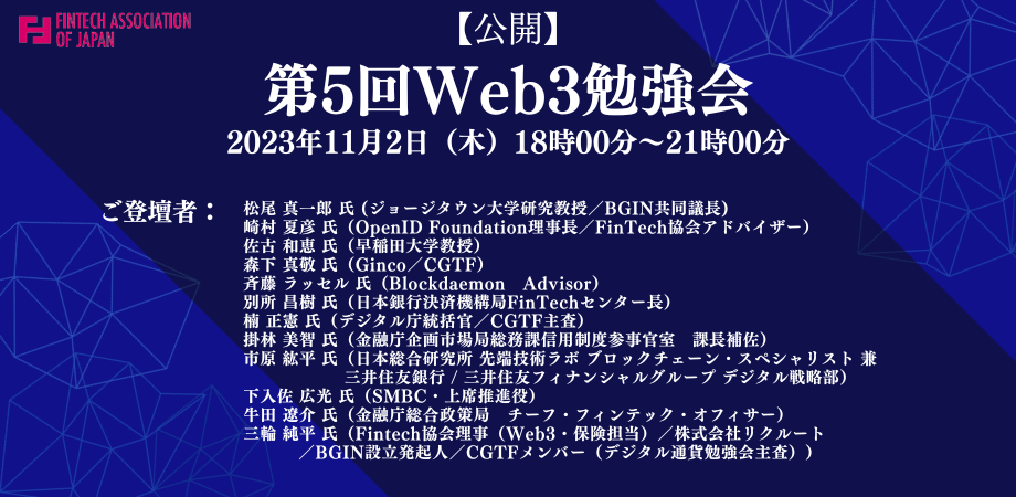 2023年11月2日(木)にFintech協会主催の第5回Web3勉強会を開催いたします。