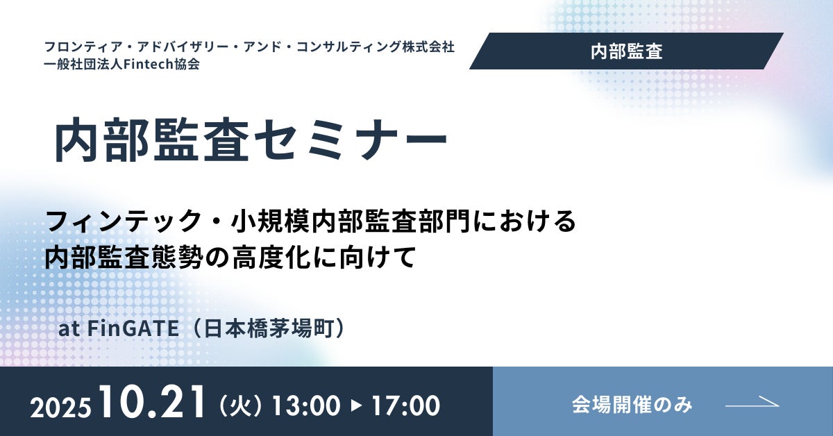 2025年10月21日(火)にフロンティア・アドバイザリー・アンド・コンサルティング株式会社と共催にて内部監査セミナー「フィンテック・小規模内部監査部門における内部監査態勢の高度化にむけて」を開催いたします。