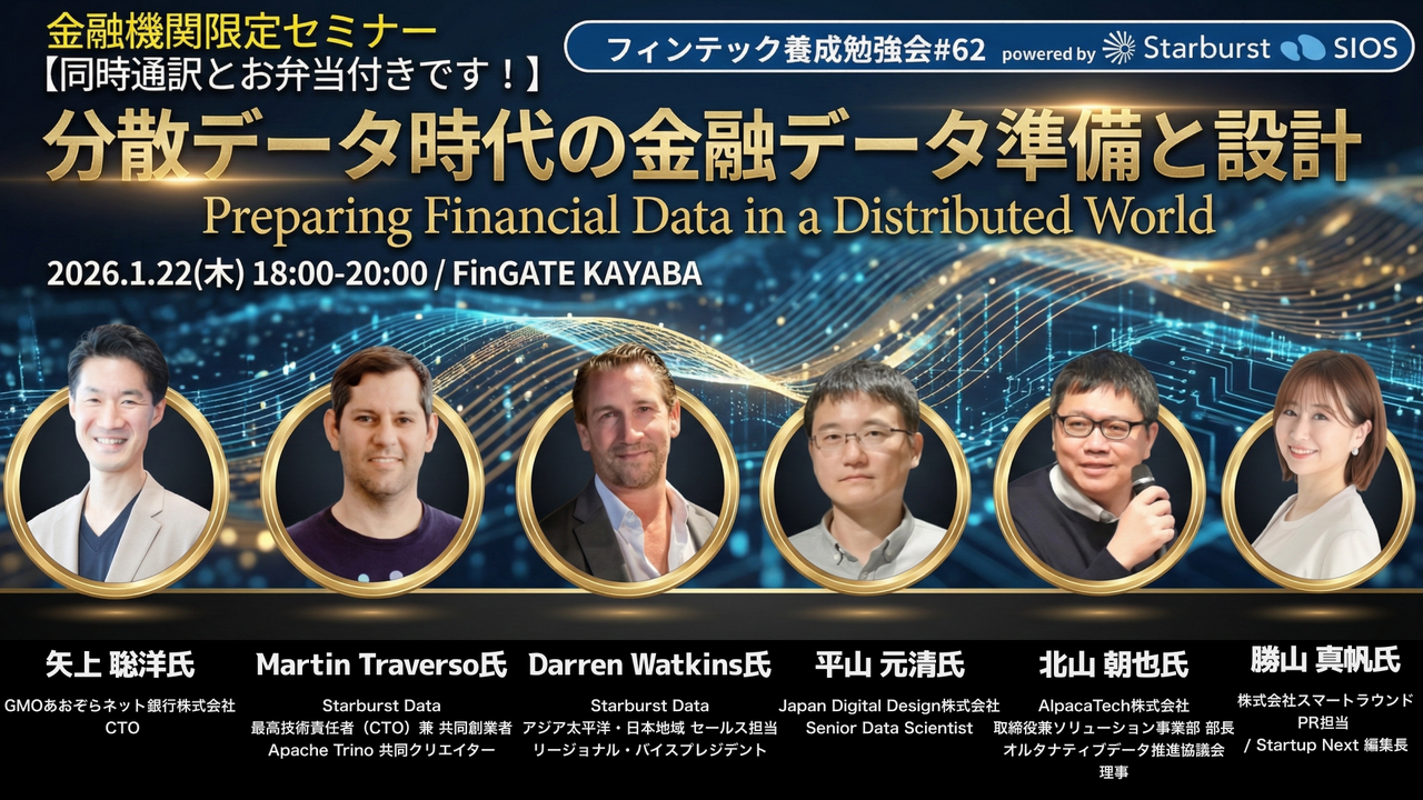 | 18:55 – 19:45 (50分) | パネルディスカッション 『分散データ時代の金融データ準備 ― 日本の現場で、どこが詰まり、どう優先順位を付けるか』 パネラー:平山 元清(JDD) パネラー:北山 朝也(AlpacaTech) パネラー:Martin Traverso(Starburst / Apache Trino ) パネラー:Darren Watkins(Starburst) パネラー:蛯原 裕弥(Starburst / Apache Iceberg コントリビューター) モデレーター:矢上 聡洋(GMOあおぞらネット銀行) |