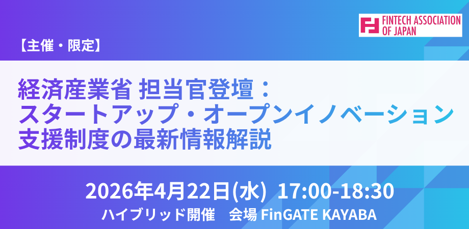 2026年4月22日(水)17時より、経済産業省の担当官をお招きし、「スタートアップ支援・オープンイノベーション支援制度」に関する解説会をFinGATE KAYABA 1Fイベントスペース(東京・茅場町)で開催いたします。